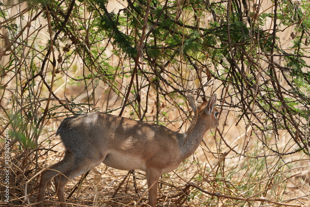 portrait of a female dikdik standing under a tree in tarangire national park tanzania, safari