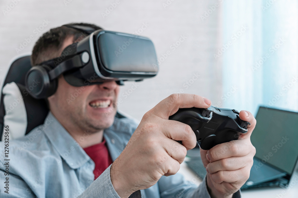 vr game and virtual reality. man gamer fun playing on futuristic simulation video shooting explore game in 3d glasses and joysticks in entertainment vr room with innovation technology.