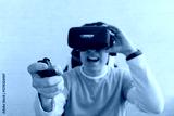 Young smiling man in VR glasses playing video game with joystick, siting on the couch while having virtual reality experience