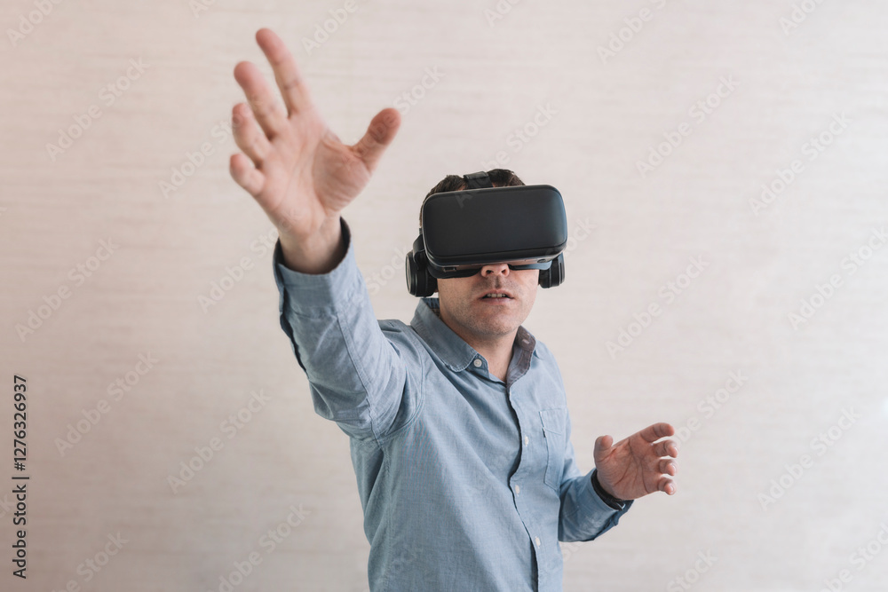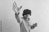 Man looking vr box on white background, Virtual Reality Glasses, cardbox. Waist up. People and technology metaverse concept. viewing 360 videos