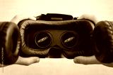 a man watching a video in virtual reality glasses. People and technology metaverse concept. 360 degree video viewing. outer space with vr glasses. Used a photo from the NASA collection