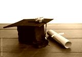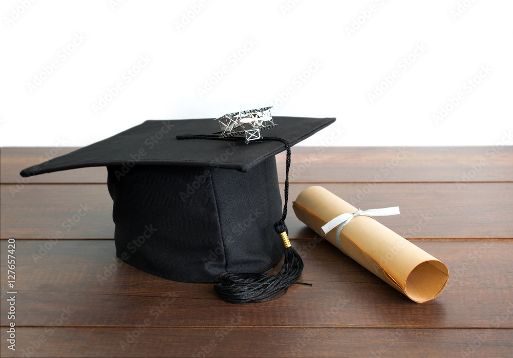 graduation cap, hat with degree paper and plane toy on wood tabl