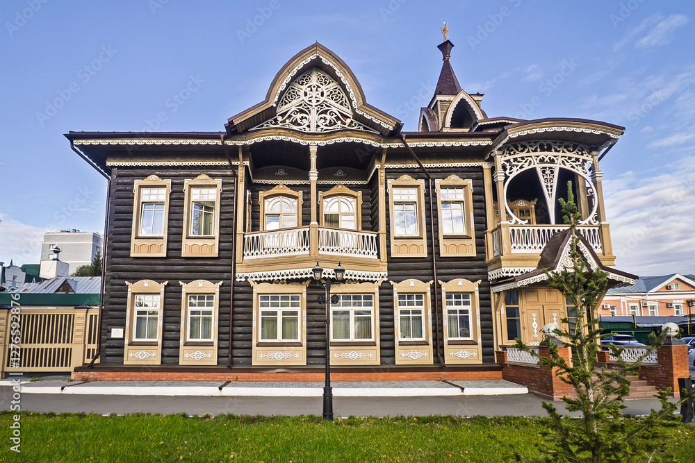 old building in the old district of Barnaul. An ancient pre-revolutionary architecture from the time of the Russian Empire. merchant's house. private house in Russian style.