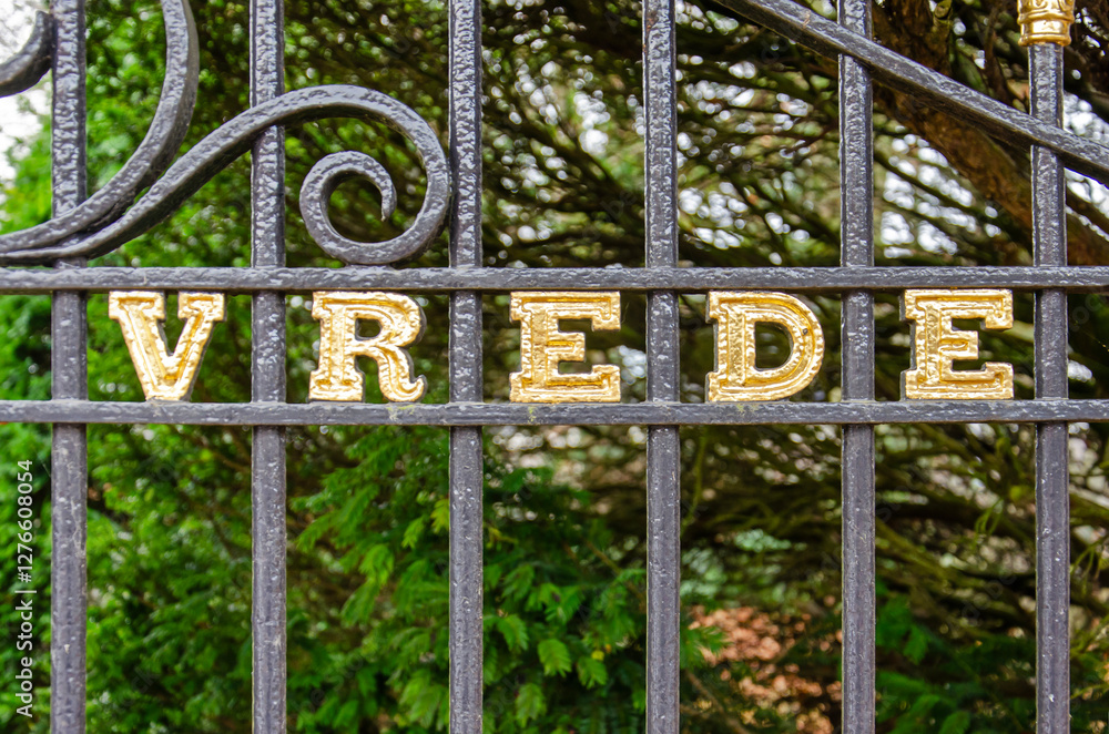 Halsteren, The Netherlands, December 6, 2024: cemetary fence with in golden letters the word "vrede" (peace)