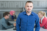 Portrait of confident young businessman with colleagues in back