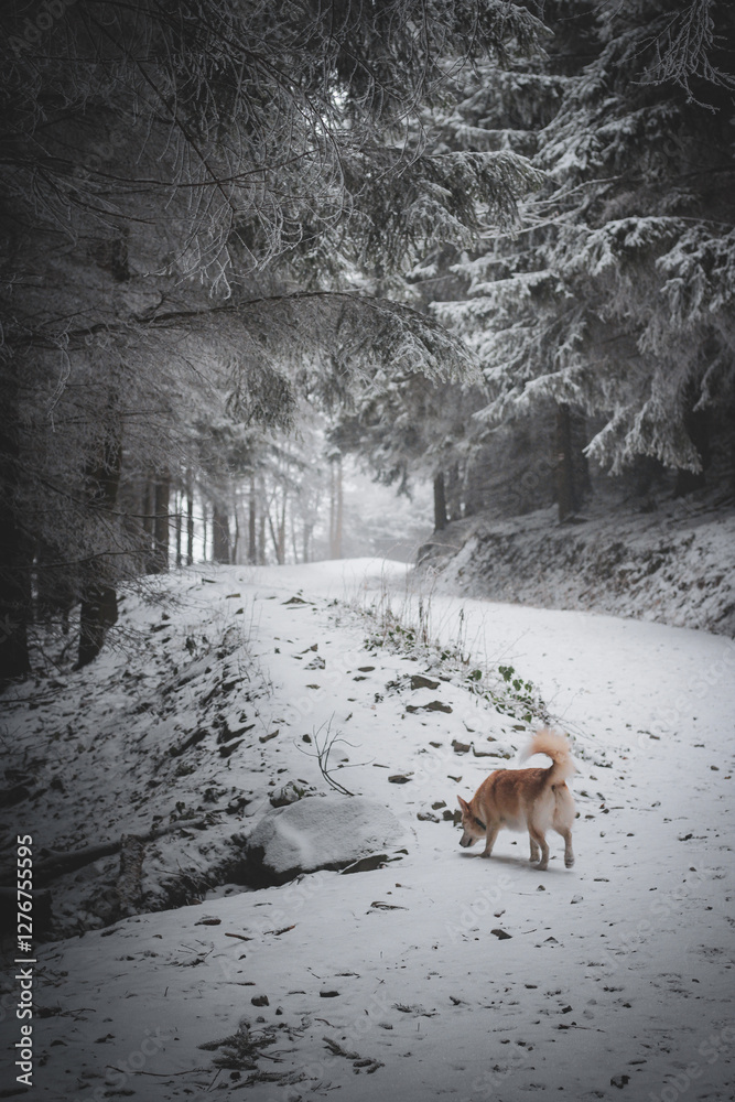 frozen trees and winter landscape covered in snow and fog when hiking in czech mountains