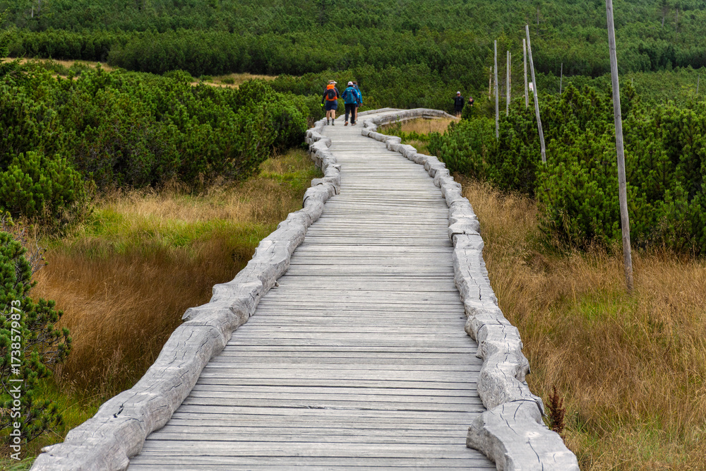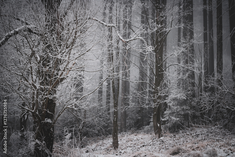 frozen trees and winter landscape covered in snow and fog when hiking in czech mountains