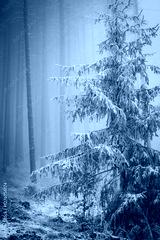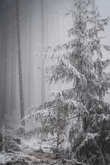 frozen trees and winter landscape covered in snow and fog when hiking in czech mountains