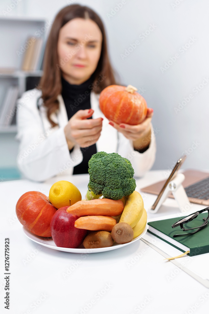 Close up vegetables on table. Doctor dietitian communicates with patient remotely via laptop, online consultation. Healthcare consulting. Telemedicine