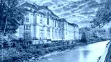Historic yellow building by the river in Feldkirch Austria surrounded by autumn foliage under a cloudy sky in a picturesque European cityscape