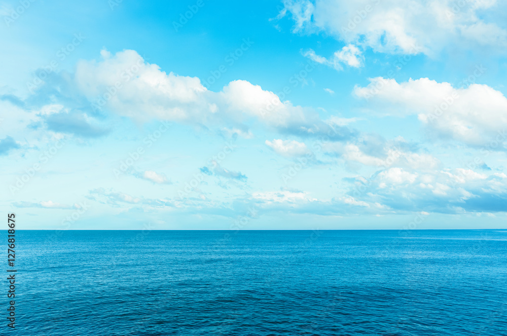 Sky and Sea blue ocean backdrop,Background Blue sky,white fluffy cloud over abstract sea water wave texture by the beach for summer holiday banner,Beauty nature spring landscape with sunlight on could