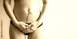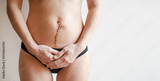 Woman's body with a surgical scar on her abdomen stitched with metal staples after a gynecological operation hysterectomy or laparotomy, or after giving birth by cesarean section, close-up, copy space