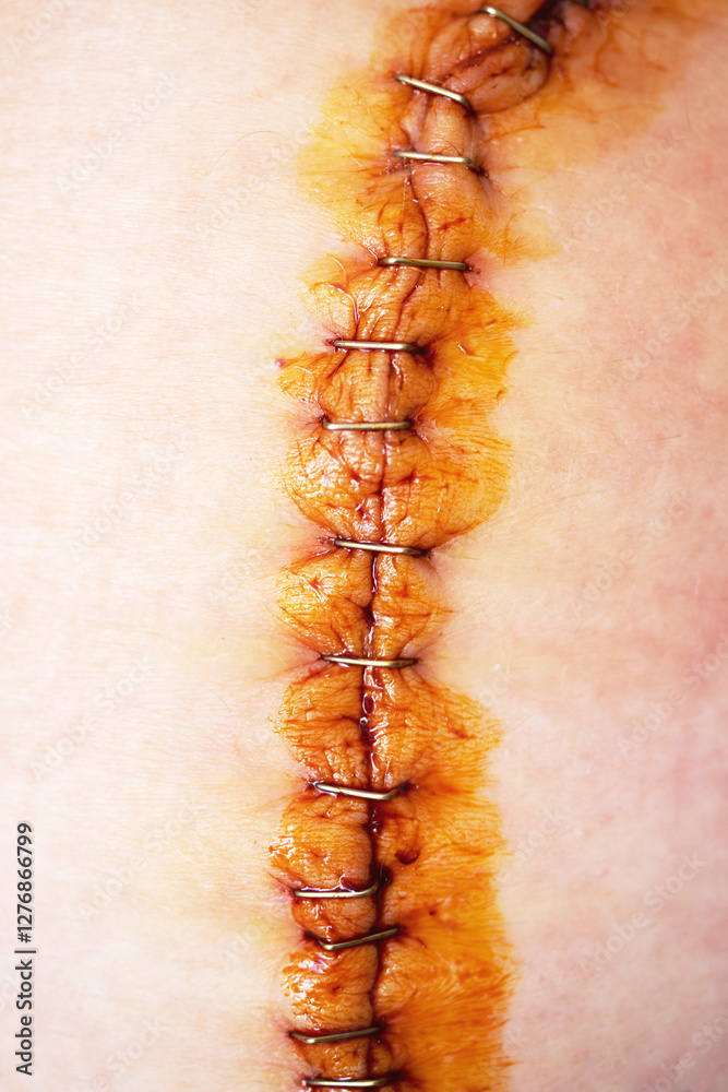 Surgical suture on abdomen stitched with metal staples after surgery treated with iodine, close-up
