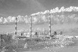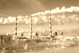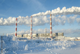 Gas power station in cold winter landscape. Pipes with smoke. Energy industry concept.