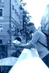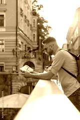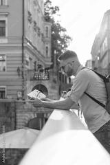 Young man, city break traveler looking at the tourist map while sightseeing and exploring attractions. Traveling lifestyles concept.
