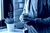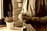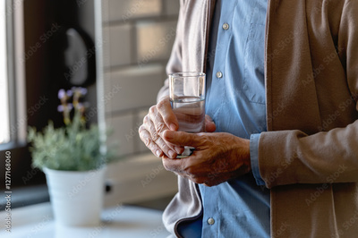 An elderly person in a blue shirt and beige cardigan holds a glass of water indoors near a window, with a potted plant in the background