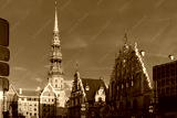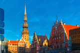 City Hall Square with House of the Blackheads and Saint Peter church in Old Town of Riga in the evening, Latvia