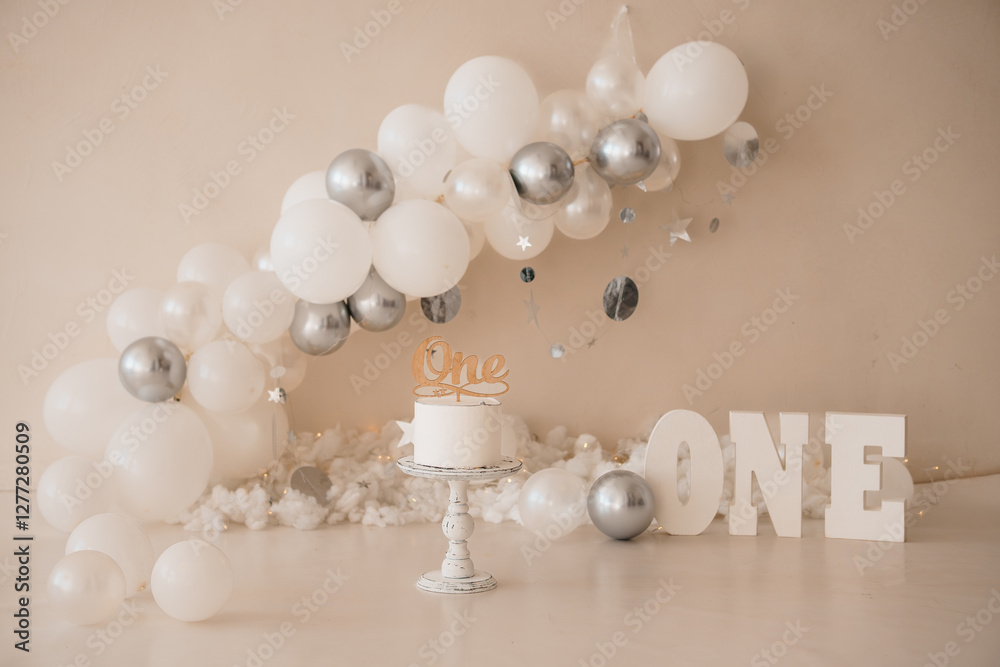 Elegant First Birthday Celebration with Balloon Arch and Cake