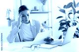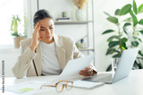 Frustrated caucasian business woman, looking stressed because of results of work, holding her head while reading a document at her desk, feeling confused, upset and disappointment