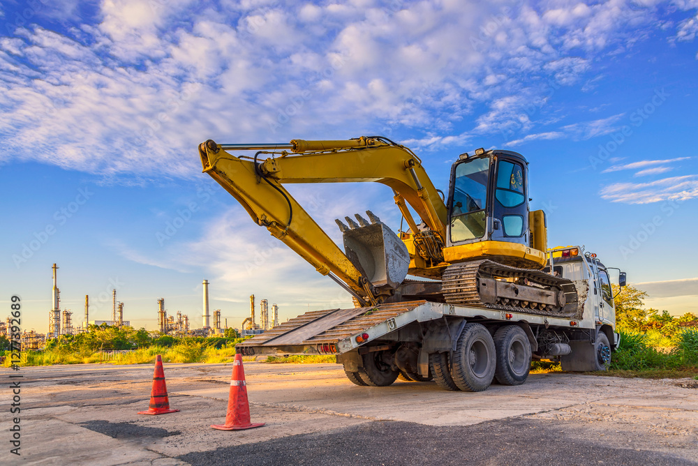Wheel loader excavator machine cars park on the truck at the construction site