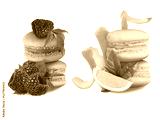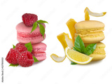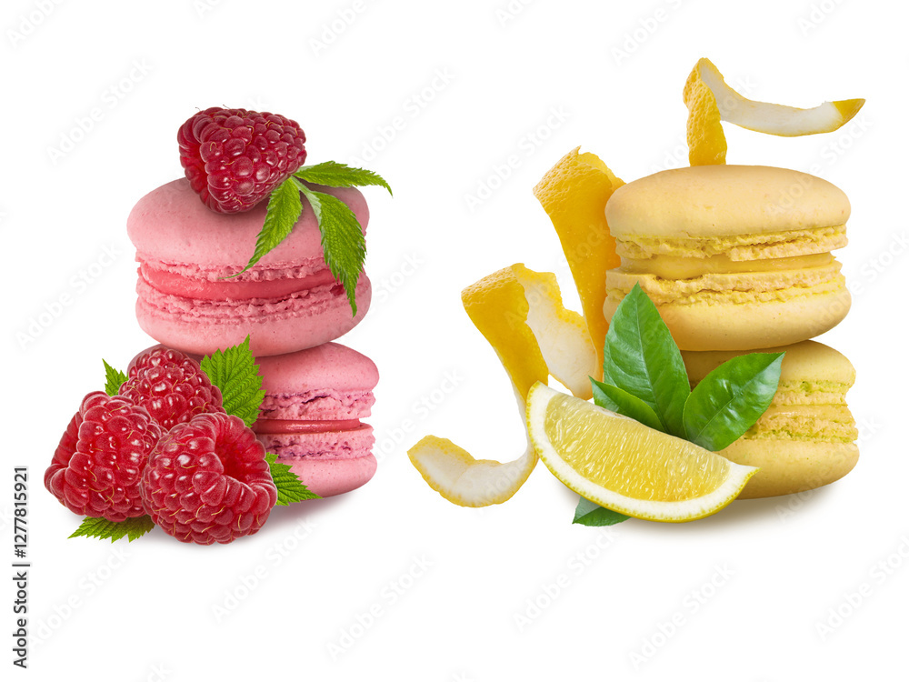 Macaroon almond cookies group with raspberry and lemon isolated on white background