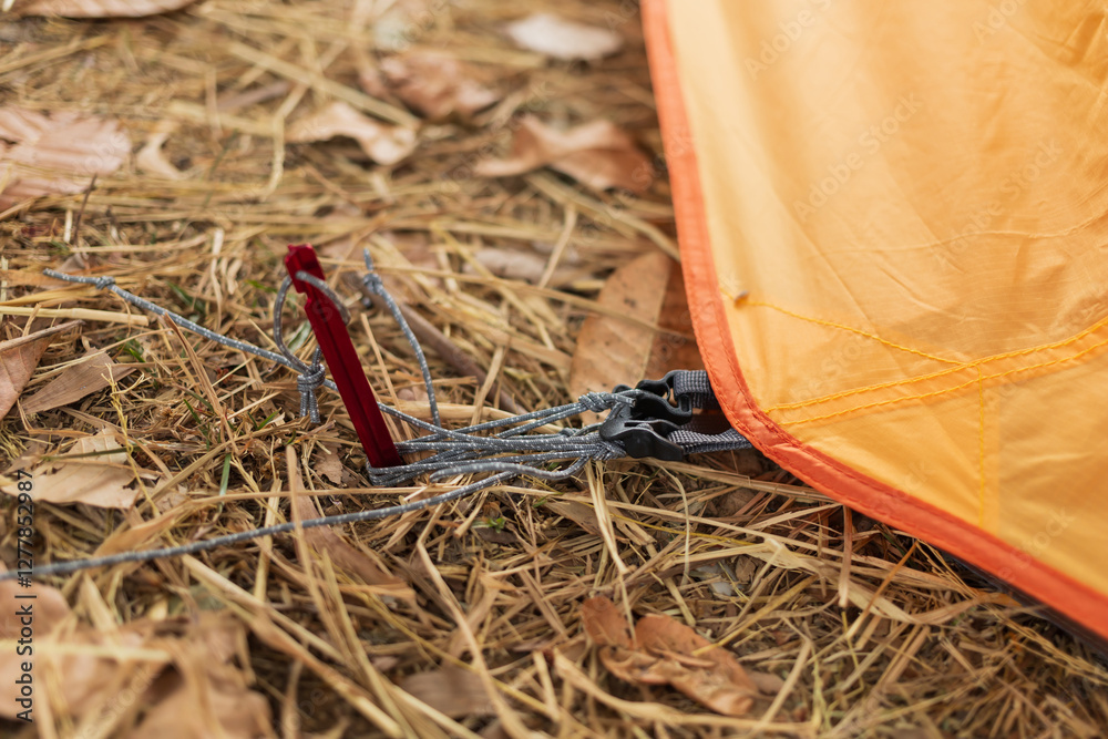 Part of an orange tent set up on the ground covered with dry leaves and grass. Nature tourism concept.