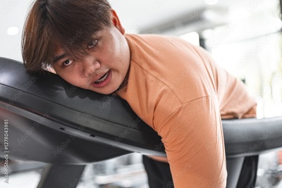 Tired overweight man exercising at gym exhausted yet determined fitness environment close-up view