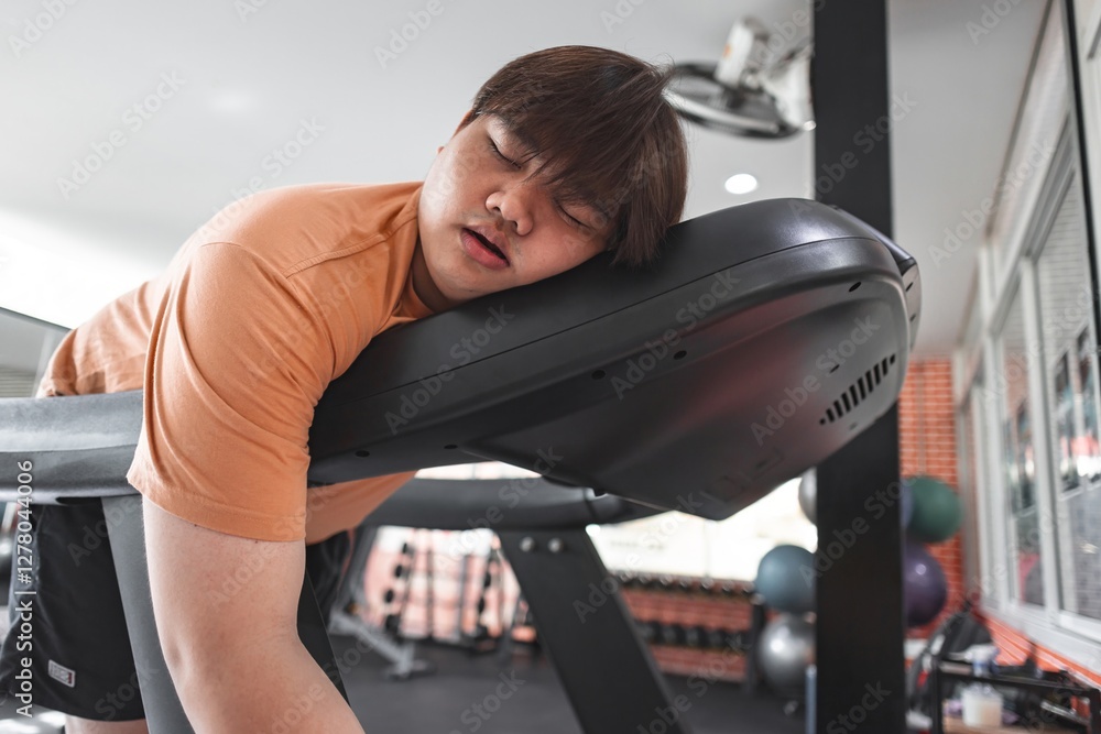 Exhausted fat man struggles with overweight exercise at gym tired environment exhausting concept