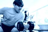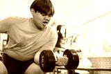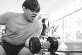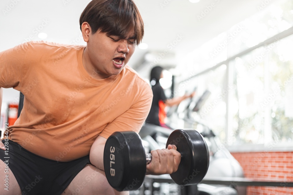 Overweight man struggles with exercise gym fitness indoor exhausted journey