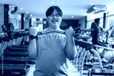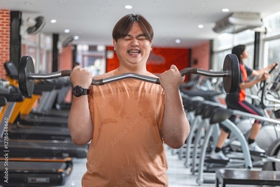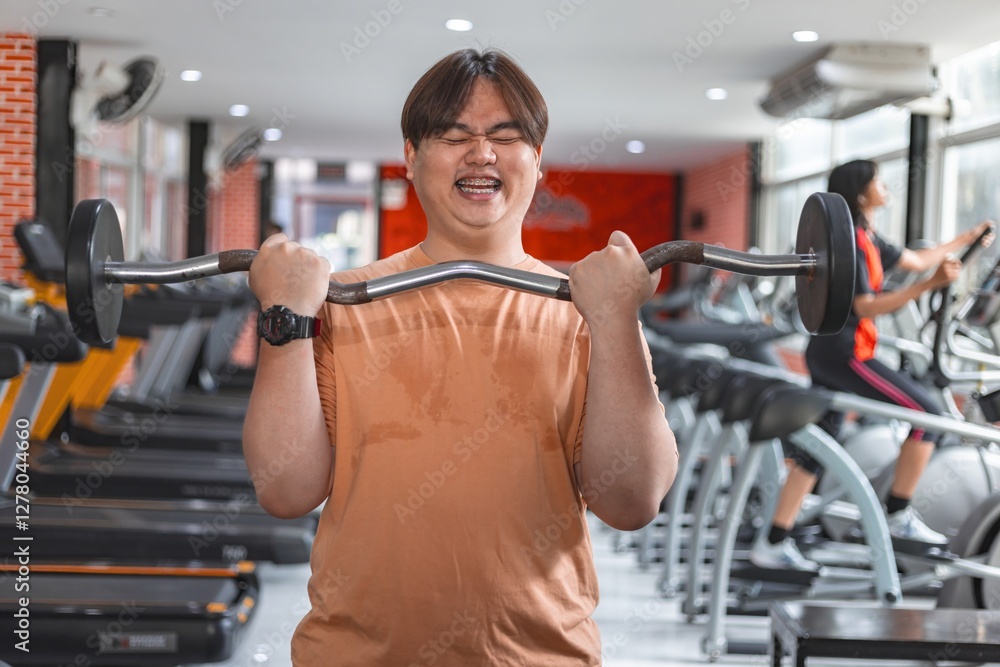 Indoor fitness motivation overweight man exercising with tired determination in gym