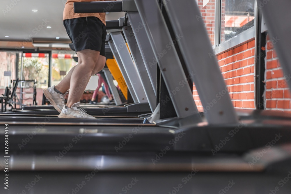 Fat man exercising on treadmill gym lifestyle indoor tired and exhausted during workout