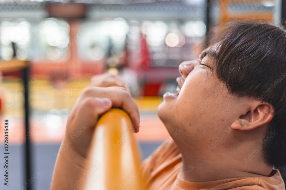 Overweight man exhausted from exercise at gym indoor fitness environment struggles with workout