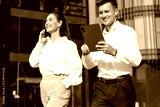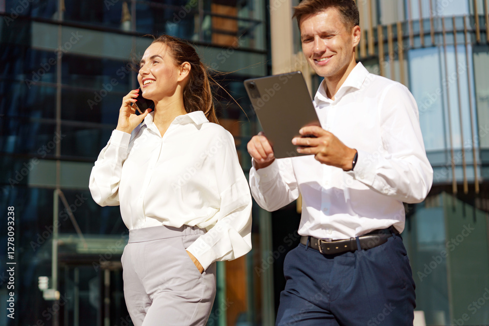Business professionals engaged in a conversation and using a tablet outside a modern office building