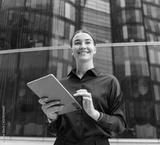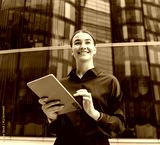 Professional woman using a tablet while standing outside a modern glass building in a bustling urban area