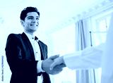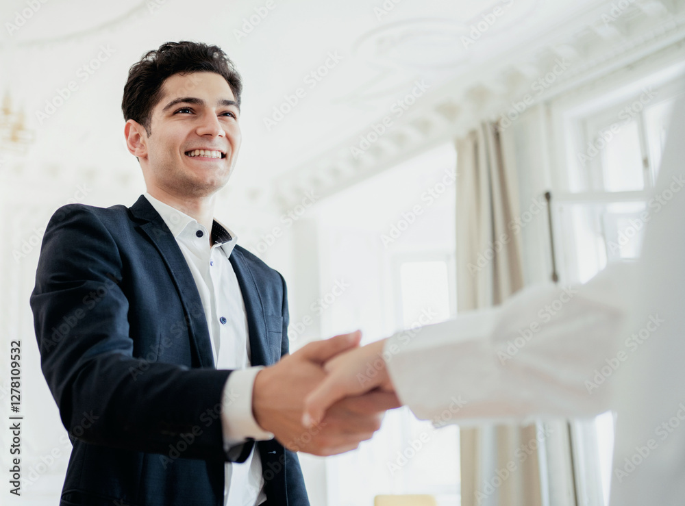 Confident young man shakes hands in a bright, modern office setting during a professional meeting