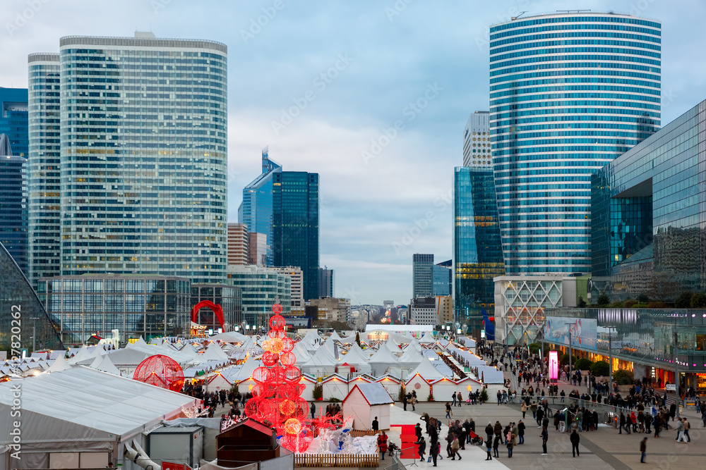 Christmas tree and market among the skyscrapers in Paris, France