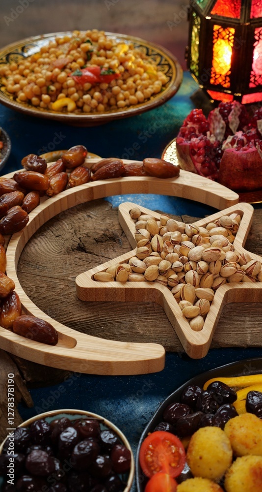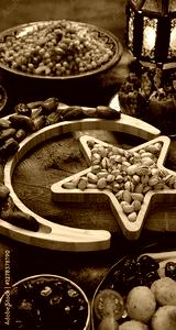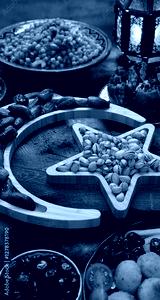 Ramadan kareem with dates, nuts and sweets arranged in shape of islamic crescent moon and star. Iftar food concept, holiday table