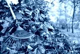 Fan rake and pile of fallen leaves in autumn park, close up view