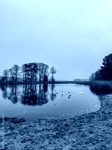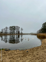Swans swimming on a pond in Kalety, Zielona in Poland, in late autumn in foggy weather. In the background, an island with a windmill