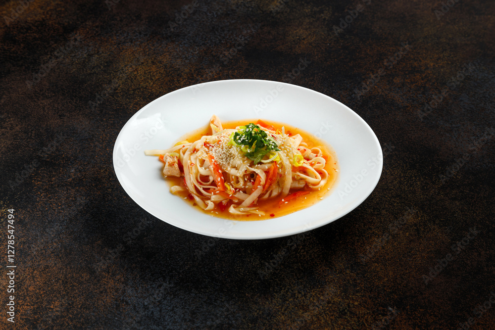 On a wooden table sits a pristine white plate adorned with meat and vegetables
