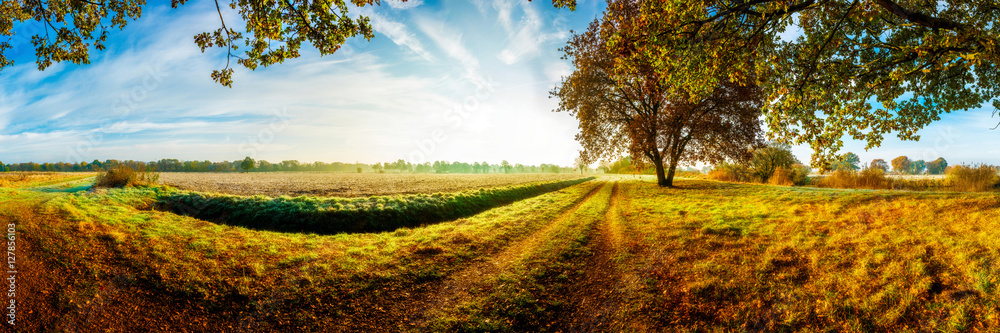 Panorama einer idyllischen Landschaft im Herbst im Licht der Morgensonne