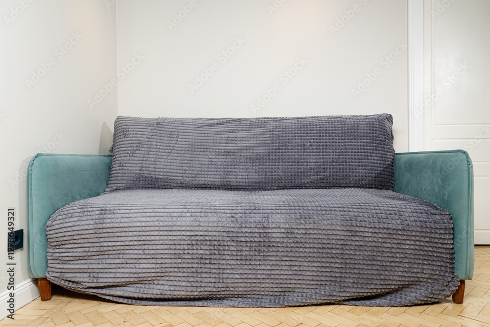 A cozy blue couch adorned with a soft grey blanket draped over it