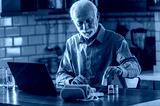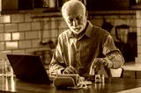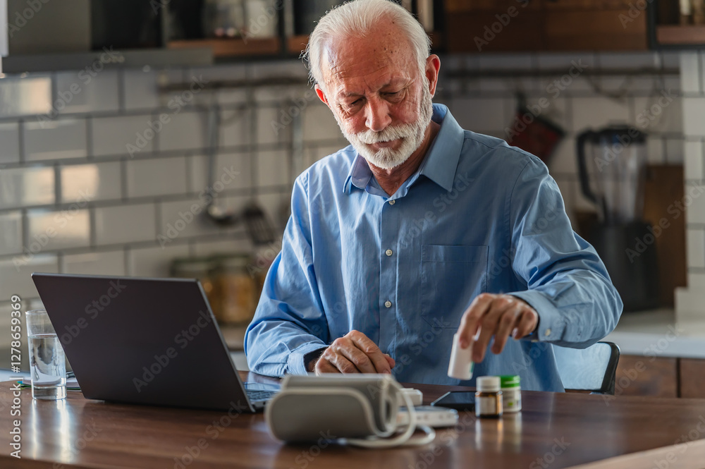 An elderly man with grey hair in his home kitchen with a laptop in front of him and pills on the table. He takes a pill with a glass of water, looking focused on his medication routine
