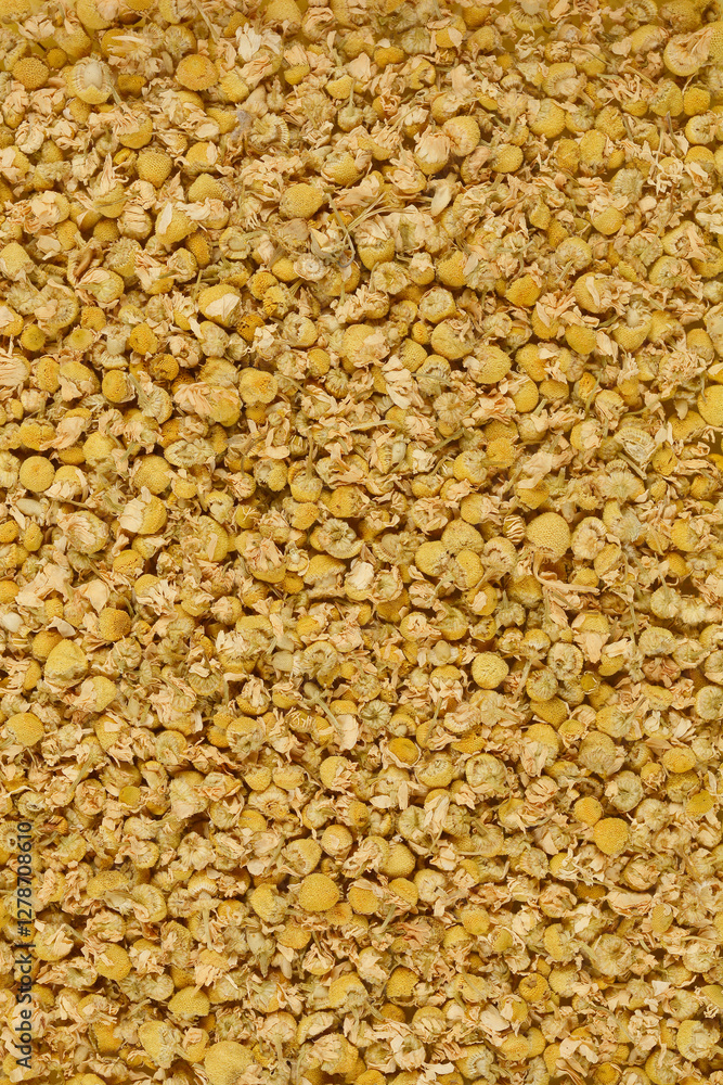 A close-up shot of dried chamomile flowers, showcasing their delicate petals and yellow centers.