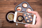 Breakfast baked eggs with bacon in muffin tin. Cup of coffe.