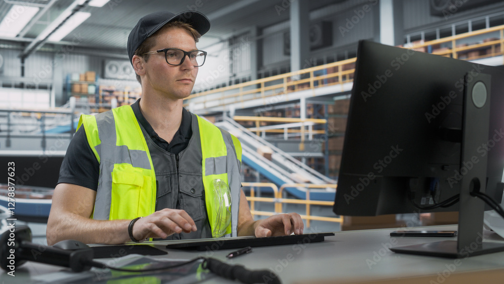 Male Stocking Manager Checking Inventory On Desktop Computer In Warehouse Facility With Automated Conveyor Belt. Logistics Company Employees Carrying Boxes to Package Products And Deliver to Clients.