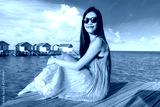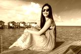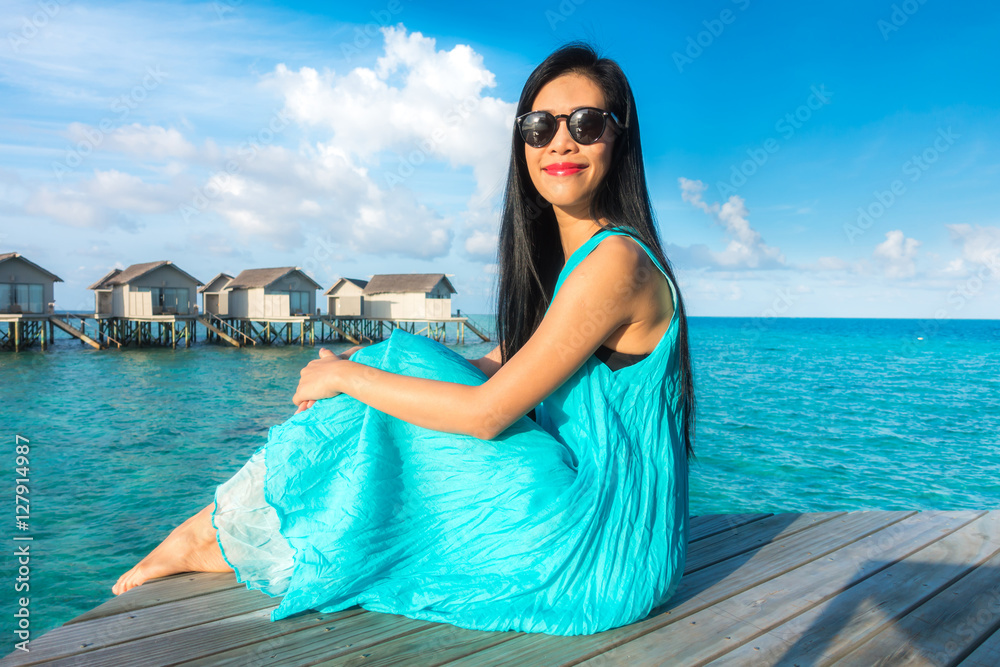 Portrait of happy young woman at beautiful water villa at Maldiv