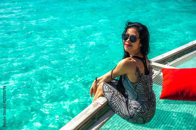 Portrait of happy young woman at beautiful water villa at Maldiv