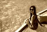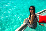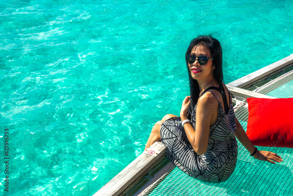 Portrait of happy young woman at beautiful water villa at Maldiv