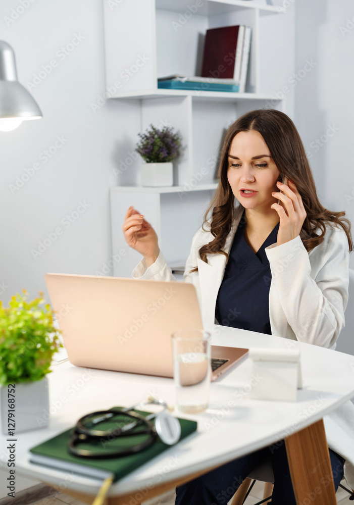 A doctor in the office sits at a table and talks on the phone taking notes in medical journal, filling documents, patient illness history, looking at laptop screen. Online doctor on laptop.